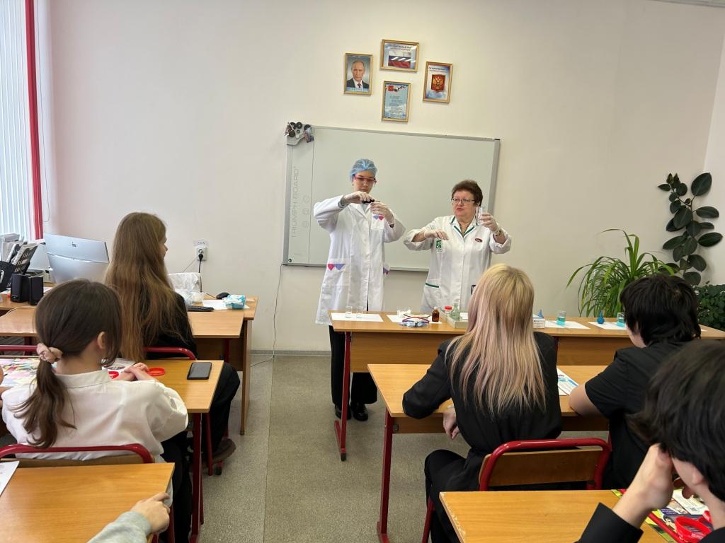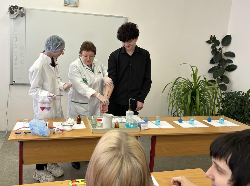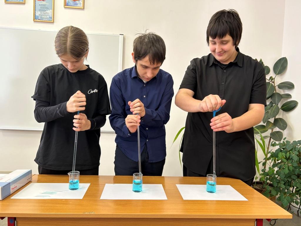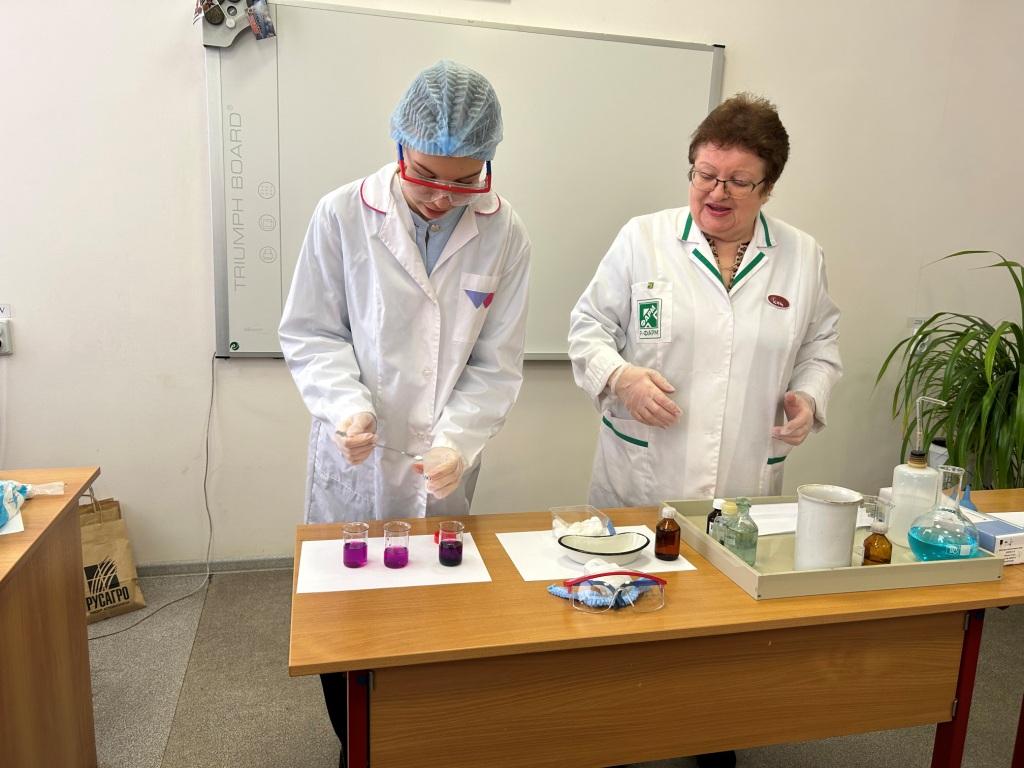 На мастер-классах ребята узнали о профессии лаборанта химического анализа. Под руководством заместителя директора и преподавателя техникума И.В. Улухановой попробовали провести некоторые химические эксперименты самостоятельно.